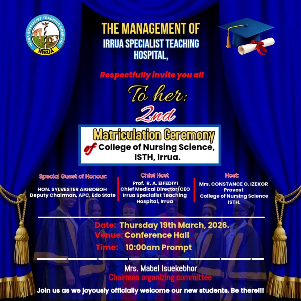 The Management of Irrua Specialist Teaching Hospital (ISTH) is pleased to invite members of the public to the 2nd Matriculation